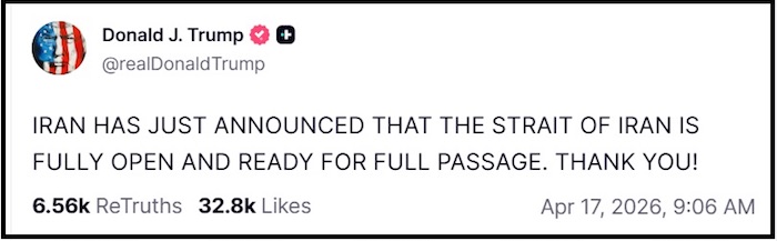 “Iran has agreed to never close the Strait of Hormuz again. It will no longer be used as a weapon against the World!” ~President DONALD J. TRUMP