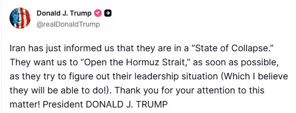 “Iran has just informed us that they are in a “State of Collapse.” They want us to “Open the Hormuz Strait,” as soon as possible, as they try to figure out their leadership… pic.twitter.com/4V22MJ5yfb