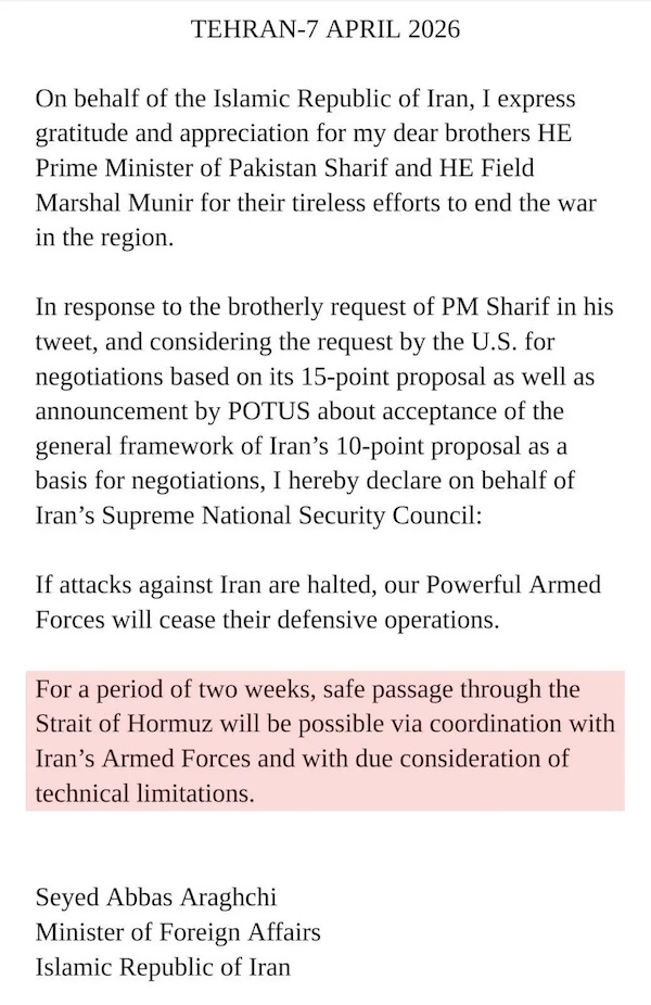 Alayna Treene (@alaynatreene) Israel is a part of the two-week ceasefire Trump agreed to just an hour and a half before his deadline, a senior White House official tells CNN. Israel has agreed to also suspend its bombing campaign while negotiations continue, the official said. And the most important variable, Iran, is also on the same page, and accepts Pakistan’s two-week ceasefire proposal with the deal approved by the New Supreme Leaders, according to Iran’s Foreign Minster, Aragchi. More importantly, Iran has said that safe passage via Hormuz “possible” for two weeks.