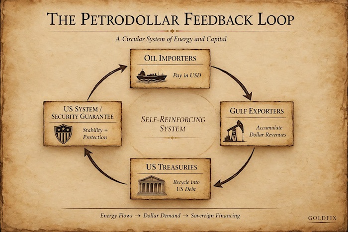 After reading a Bloomberg opinion piece deconstructing the Petrodollar stresses currently manifesting from the war with Iran the following became apparent. The longstanding financial arrangement in which the United States underwrote stability in the Middle East in exchange for Gulf states recycling dollar revenues into US Treasuries has fractured. What functioned for decades as a reinforcing loop between energy flows, dollar demand, and sovereign financing is now under strain. The framework traces back to the 1974 agreement engineered under Henry Kissinger, in which Saudi Arabia priced oil in dollars and reinvested surpluses into US assets, primarily Treasuries. Other Gulf states followed, while the United States provided security guarantees and maintained the broader geopolitical order.Read more …