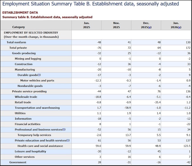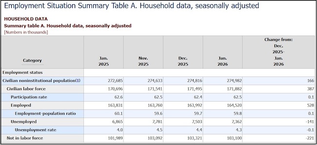 Via WSJ – “The U.S. added 130,000 jobs in January, surging past expectations and marking a strong start to the year following a weak year of job growth. The January numbers from the Labor Department were above the seasonally adjusted 48,000 jobs added in December, which were revised slightly lower. Economists polled by The Wall Street Journal were expecting 55,000 jobs in January.The unemployment rate, which is based on a separate survey from the jobs figures, fell to 4.3% from 4.4%.” (more)What I find interesting in the Household ‘Employment’ Survey is the number of people going back into the workforce. I am left to wonder if the ICE removals are starting to create employer driven incentives, increased wages etc. that seem to be pulling sidelined workers back to the labor market.