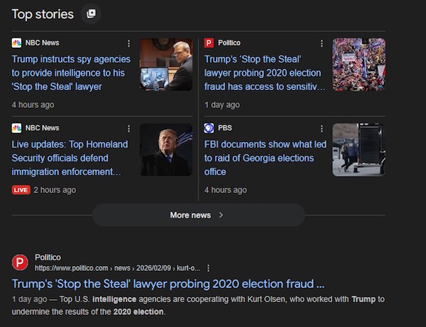… President Donald Trump has directed top U.S. spy agencies to share sensitive intelligence about the 2020 election with his former campaign lawyer, known for pushing debunked theories of electoral fraud, according to four people with knowledge of the effort. -Politico. Indeed: