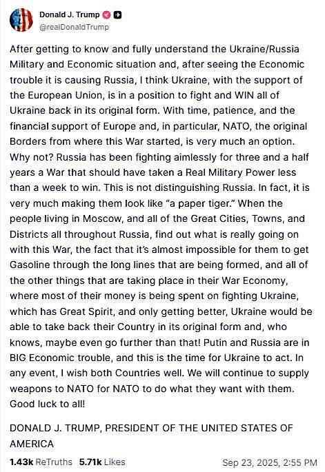 The president said that, with backing from Europe and NATO and enough time and patience, it is “very much an option” for Ukraine to drive Russian forces out and restore its borders. “Why not? Russia has been fighting aimlessly for three and a half years a War that should have taken a Real Military Power less than a week to win,” Trump wrote. “This is not distinguishing Russia. In fact, it is very much making them look like ‘a paper tiger.’” Trump said Russia’s faltering economy, shortages at home, and growing public discontent could tip the balance further in Ukraine’s favor. He described Ukraine as having “Great Spirit” and growing stronger as the war drags on, while warning that Russian President Vladimir Putin faces “BIG Economic trouble.” “This is the time for Ukraine to act,” Trump wrote, adding that he wishes both countries well, and that the United States would continue to supply weapons to NATO “for NATO to do what they want with them.”