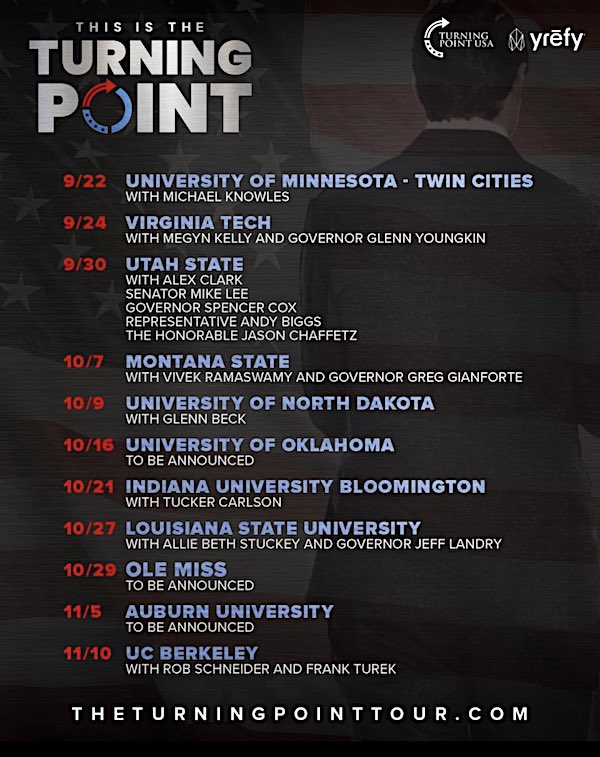 Turning Point USA has announced speakers to help maintain the TPUSA mission of Charlie Kirk. The schedule is being worked out, but names like Megyn Kelly, Vivek Ramaswamy, Rob Schieder, Tucker Carlson, Glenn Beck and Michael Knowles will assist. It is awesome to see people stepping into the breach.